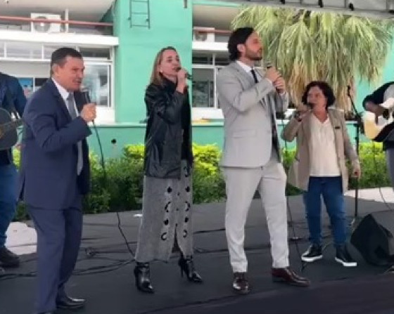 Após a sessão ordinária desta terça-feira (24), os vereadores Daniel Monteiro (Republicanos), Demilson Nogueira (PP), Baixinha Giraldelli (Solidariedade) e Katiuscia Mantelli (PSB) soltaram a voz em frente à Câmara de Cuiabá. A apresentação ocorreu durante a 4ª edição da Feira Mãos Cuiabanas.