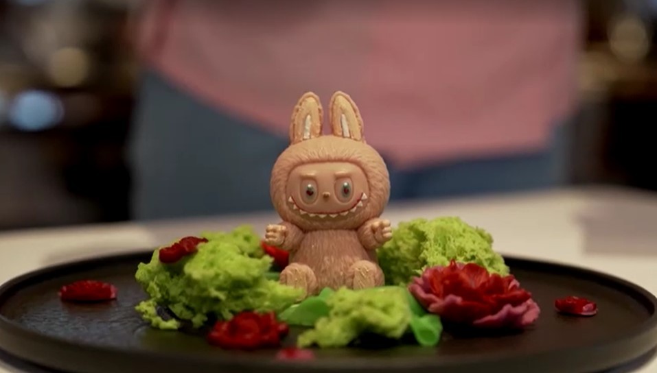 Sobremesa em formato de boneco Labubu servida em restaurante de Moscou