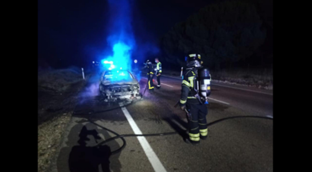 O texto relata que a foto havia sido compartilhada nas redes sociais dos bombeiros. A legenda do post detalhava as circunstâncias da ocorrência: “🚒🔥Atuamos em um incêndio de veículo na CL-600, no município de Tudela de Duero”.