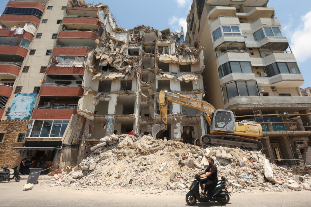 Motociclista passa diante de prédio ainda destruído por conta dos bombardeios de Israel no sul do Líbano, em 3 de julho de 2025.