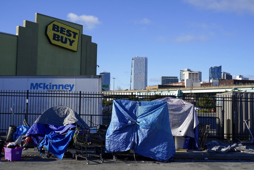 Barracas de moradores de rua diante de loja de departamentos em São Francisco, nos EUA, em 13 de dezembro de 2022.
