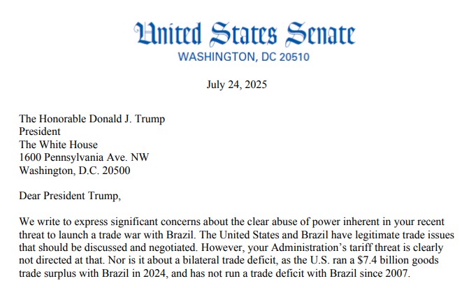 Carta de senadores dos EUA a Trump sobre tarifas impostas ao Brasil