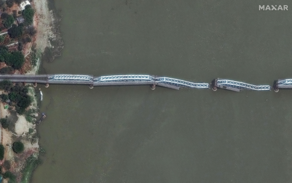 Uma imagem de satélite mostra a Ponte Inwa, que desabou após um terremoto, em Mandalay, Mianmar, em 29 de março de 2025
