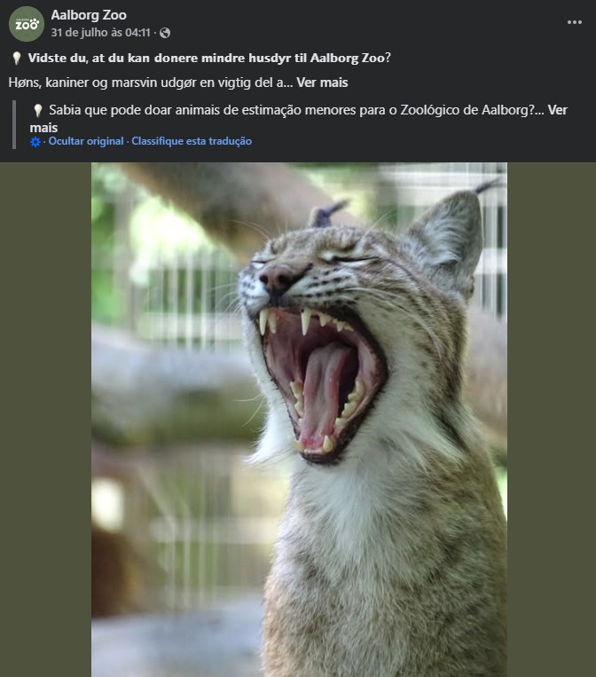 “Galinhas, coelhos e porquinhos-da-índia constituem uma parte importante da dieta dos nossos predadores, especialmente o lince europeu, que precisa de presas inteiras que se assemelhe ao que ele caçaria naturalmente na natureza. (…) Se você tem um animal saudável que precisa ser sacrificado por diversos motivos, sinta-se à vontade para doá-lo para nós”, diz o post.