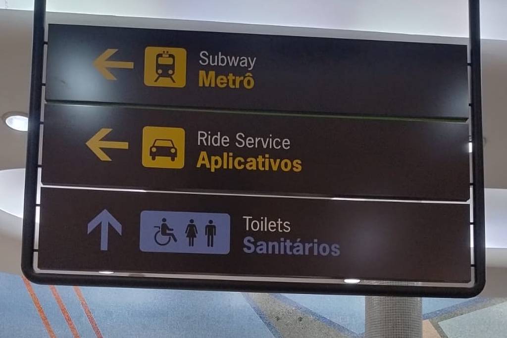 As placas, em português e inglês, estão no interior e na parte externa do aeroporto. E há outras informações, como indicação para estacionamento ou para a praça pick-up, um novo viário para carros de aplicativo, mas ainda em obras.