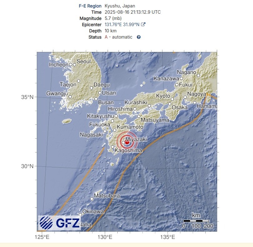 Um terremoto de magnitude 5,7 atingiu a ilha de Kyushu no Japão, neste sábado (16), segundo o Centro Alemão de Pesquisa em Geociências (GFZ). O tremor foi detectado a 10km de profundidade.