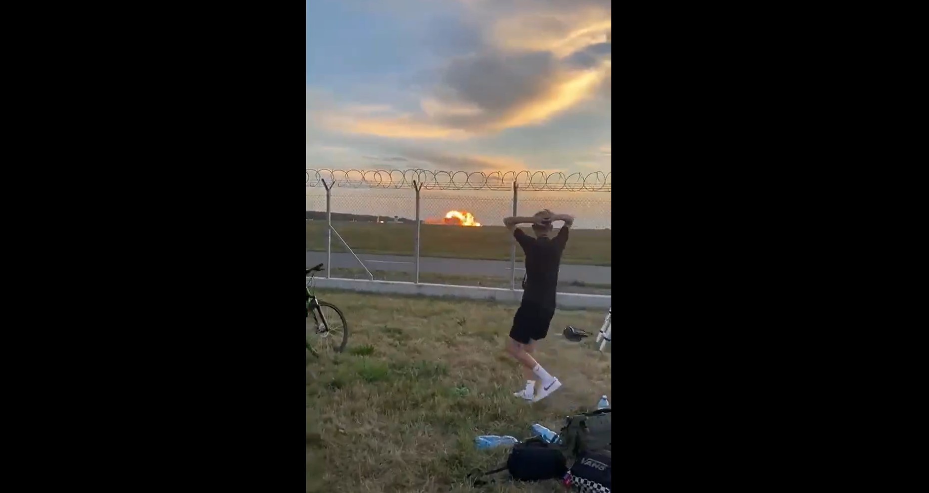 Pessoa observa explosão de caça F-16 que caiu durante ensaio para show aéreo