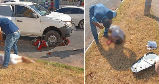 Uma mulher de 44 anos ficou ferida após a motocicleta que conduzia ser atingida por uma caminhonete Mitsubishi L200, na manhã desta segunda-feira (8), no cruzamento da Rua dos Jambos com a Rua das Rosas, em Nova Mutum (264 km de Cuiabá).