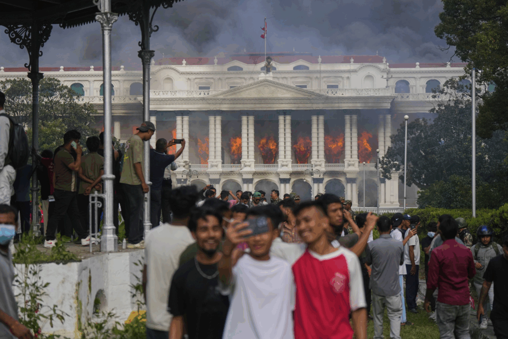 Jovens tiram selfie com o palácio do governo do Nepal em chamas ao fundo, em 9 de setembro de 2025