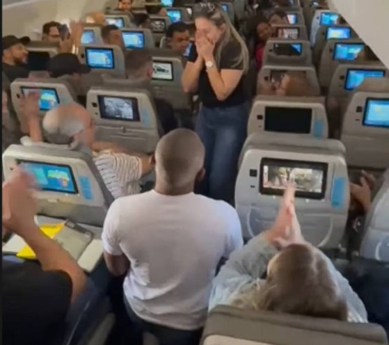 A namorada, claro, disse “sim” sem hesitar, selando a decisão do casal diante de colegas de voo e amigos.