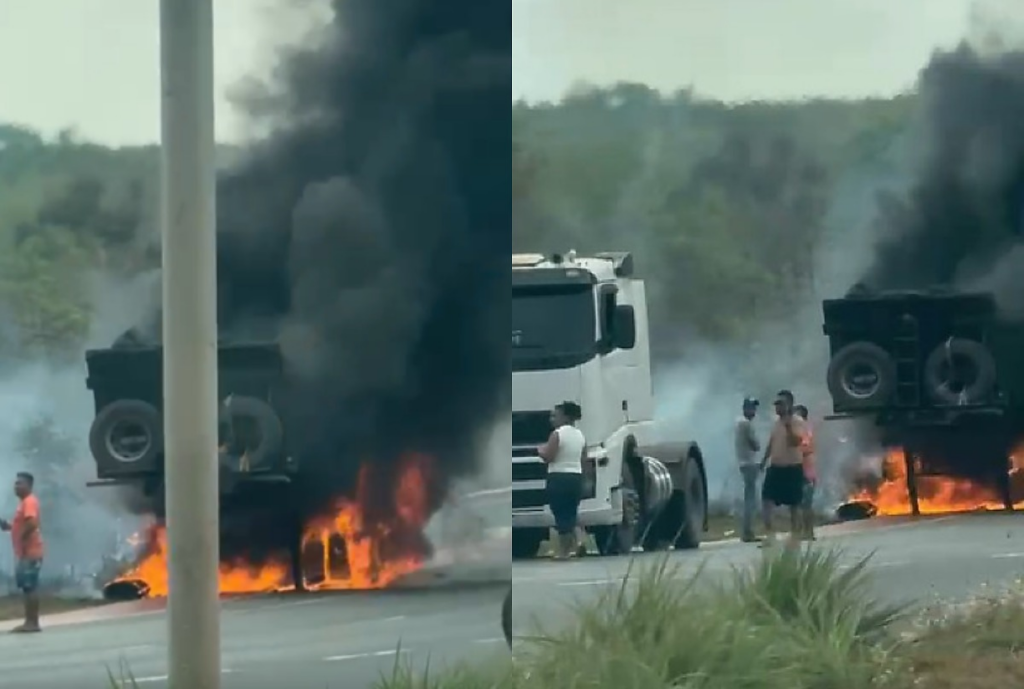 Imagens gravadas por populares mostram a traseira do veículo em chamas, além de uma fumaça escura se espalhando no ar.