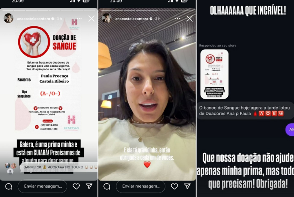 A cantora sertaneja Ana Castela, conhecida como “boiadeira” e entre as mais ouvidas nas plataformas digitais do país, está mobilizando fãs e amigos em apoio à prima, Paula Proença Castela Ribeiro, que mora em Cuiabá e precisa de transfusões de sangue. Paula está grávida e os tipos sanguíneos mais indicados para doação são A- e O-.