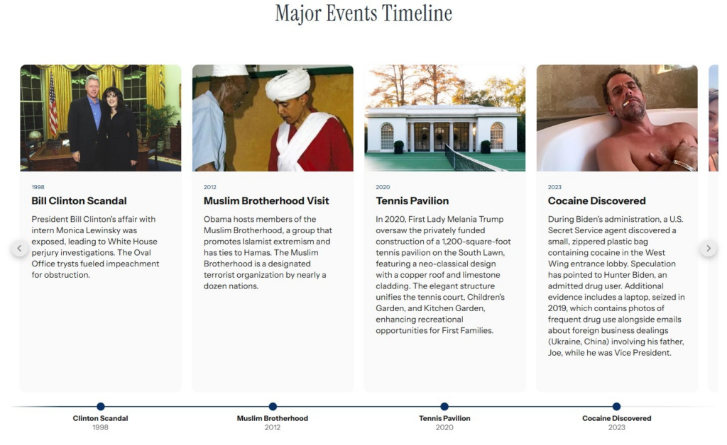 Página oficial, atualizada para incluir o novo salão de baile que está sendo feito pelo republicano, adicionou também críticas aos antecessores Bill Clinton, Barack Obama e Joe Biden. Menções variam de episódios embaraçosos a textos enviesados e acusações sem provas.