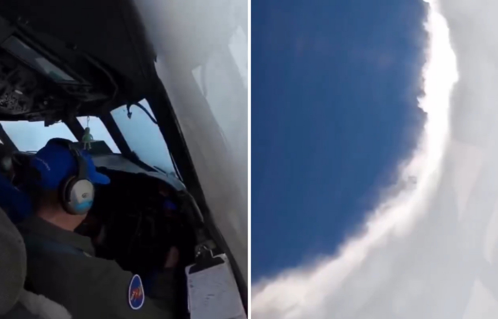 As imagens mostram três militares na cabine de uma aeronave que está passando dentro do olho de um furacão.