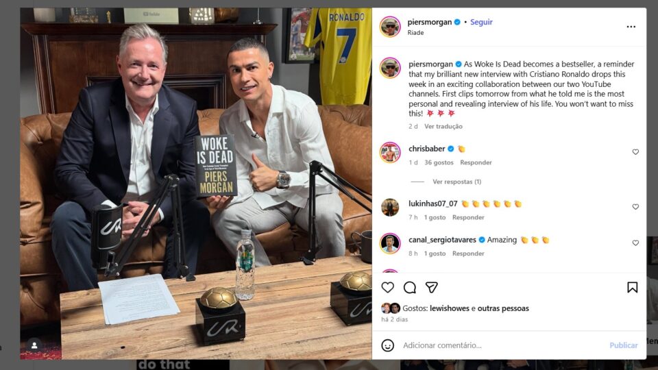Contexto: o craque português concedeu uma longa entrevista ao jornalista britânico Piers Morgan, um crítico das chamadas pautas identitárias e autor de Woke Is Dead (“O Woke Está Morto”).