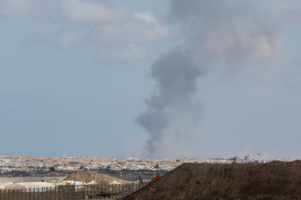 Coluna de fumaça sobe no céu da Faixa de Gaza após ataques israelenses em 29 de outubro de 2025.
