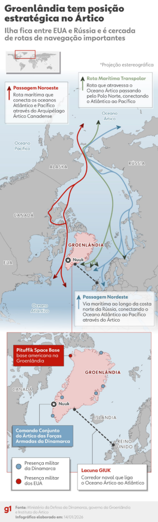 “Os EUA precisam de acesso ao Ártico, e hoje não têm muito acesso direto. A Groenlândia, por outro lado, oferece uma quantidade enorme. Precisam de defesas aéreas cada vez mais próximas da Rússia para combater armas de última geração que não são defensáveis com os recursos disponíveis atualmente e a Groenlândia também proporciona isso”, destacou Clayton Allen, chefe de operações da Eurasia Group, uma consultoria de risco político, à emissora americana CNBC em entrevista.
