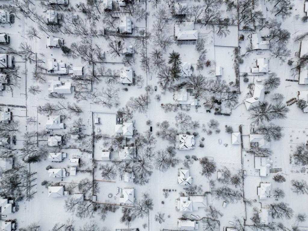 Uma foto aérea mostra vários centímetros de neve cobrindo um bairro residencial em Columbia, no Missouri.