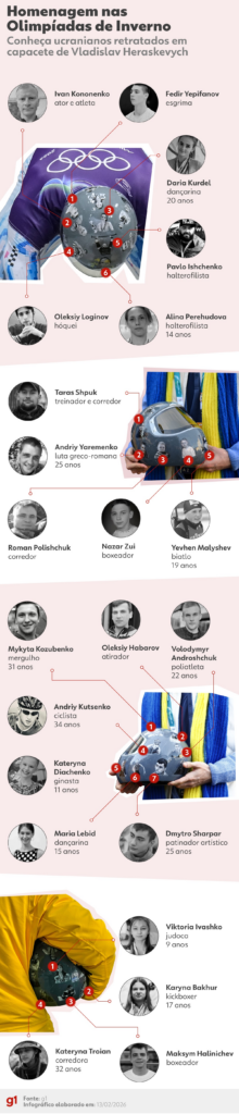 Infográfico mostra atletas homenageados em capacete por ucraniano proibido de competir na Olimpíada de Inverno de 2026, na Itália.