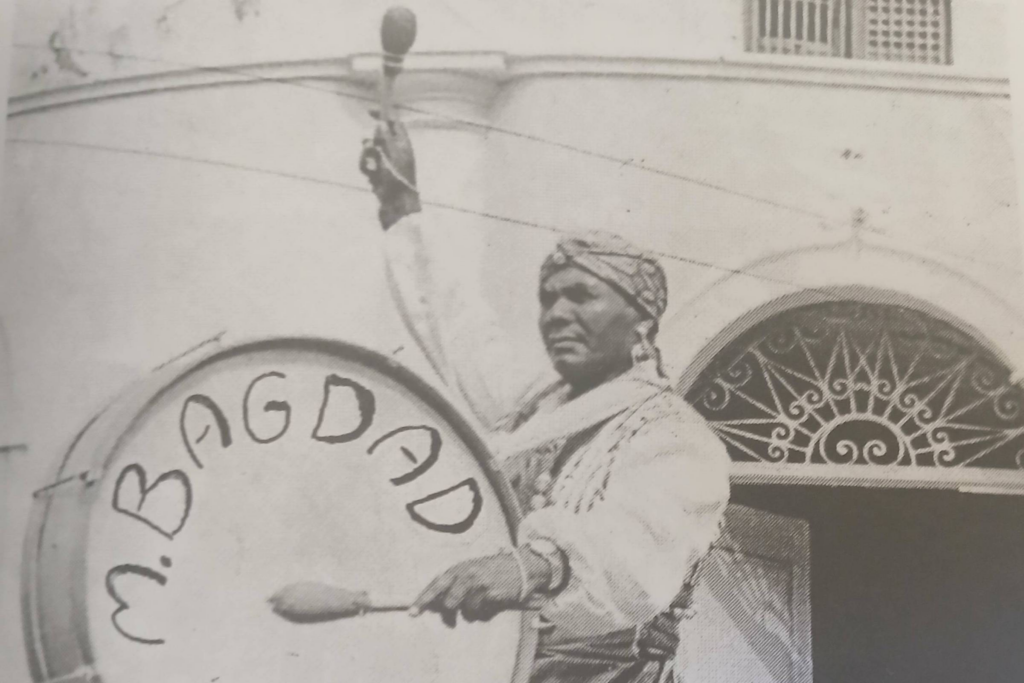 Do alto do carro alegórico dos Cavalheiros de Bagdá, surgia a figura de um homem alto e corpulento vestido com um colete metálico, turbante na cabeça e sapatos de bico fino. Com uma baqueta, ele fazia soar um gongo e usava pólvora para criar um clarão, para espanto dos foliões nos cordões e batucadas.