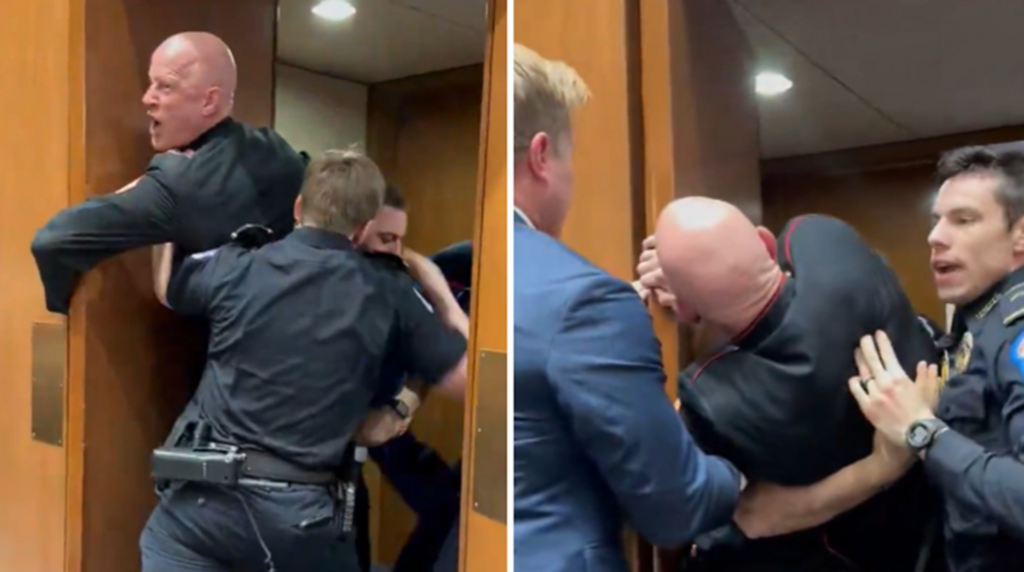 O vídeo mostra um homem com uniforme militar agarrado à porta de saída de um auditório, enquanto dois seguranças e o senador americano Tim Sheehy tentam retirá-lo à força do local. Durante a confusão, o militar grita: “Ninguém quer lutar por Israel”. Em meio ao empurra-empurra, a mão dele fica presa no vão da porta.