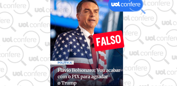 O conteúdo tem a seguinte inscrição: “POLÍTICA. Flávio Bolsonaro: Vou acabar com o Pix para agradar o Trump”.